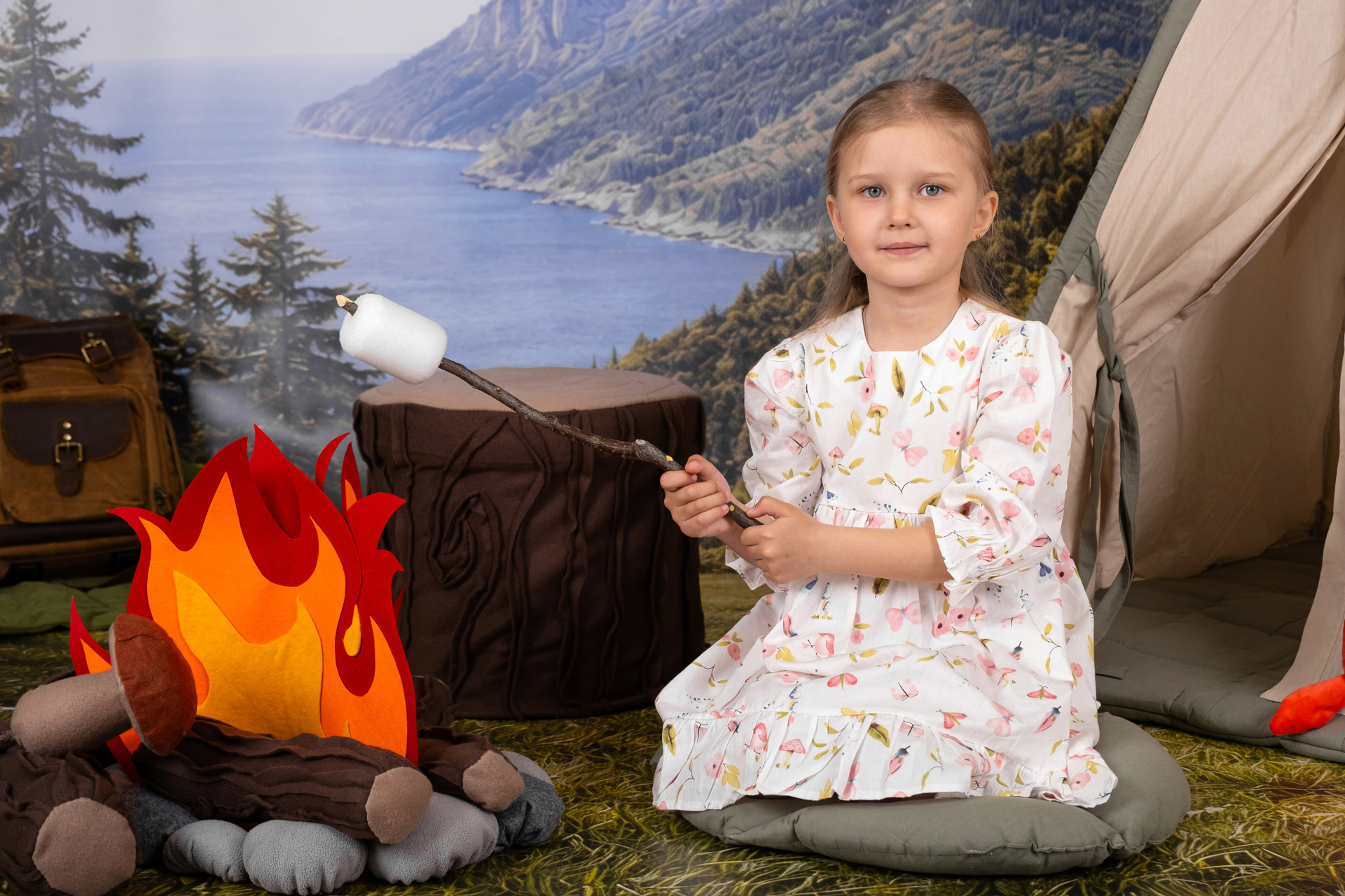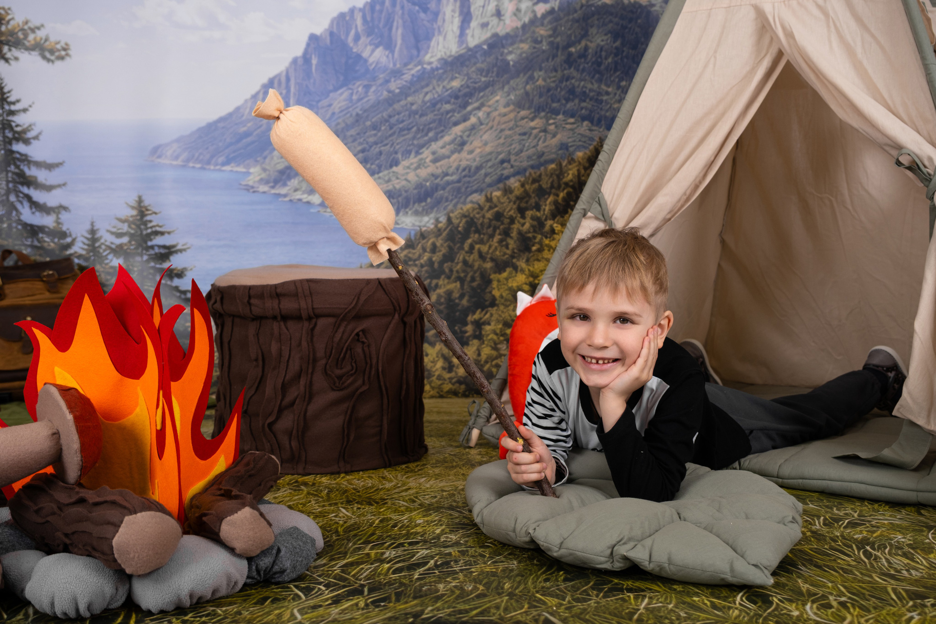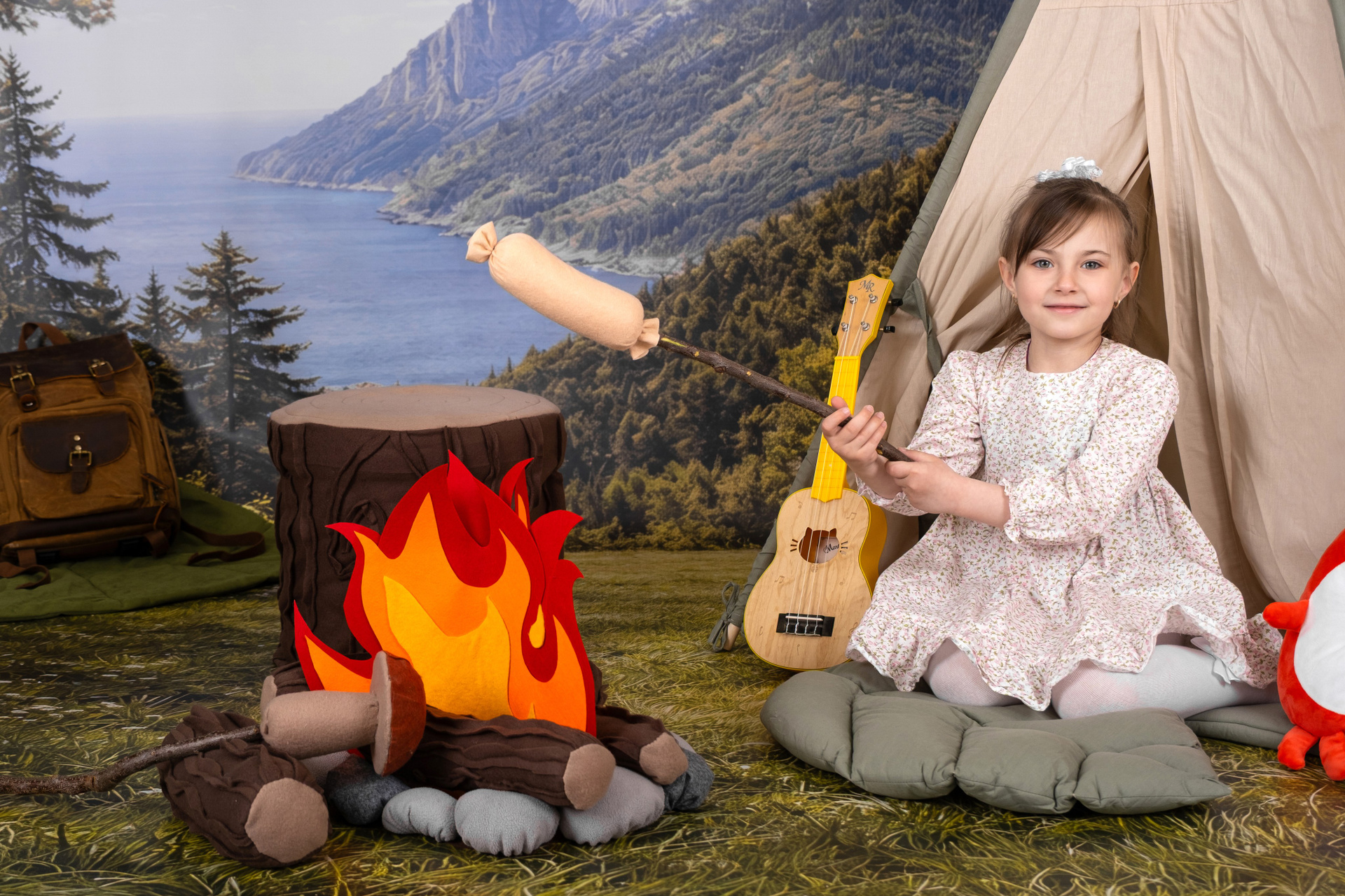 — Яркие декорации: костёр, палатка, рюкзаки, маршмеллоу