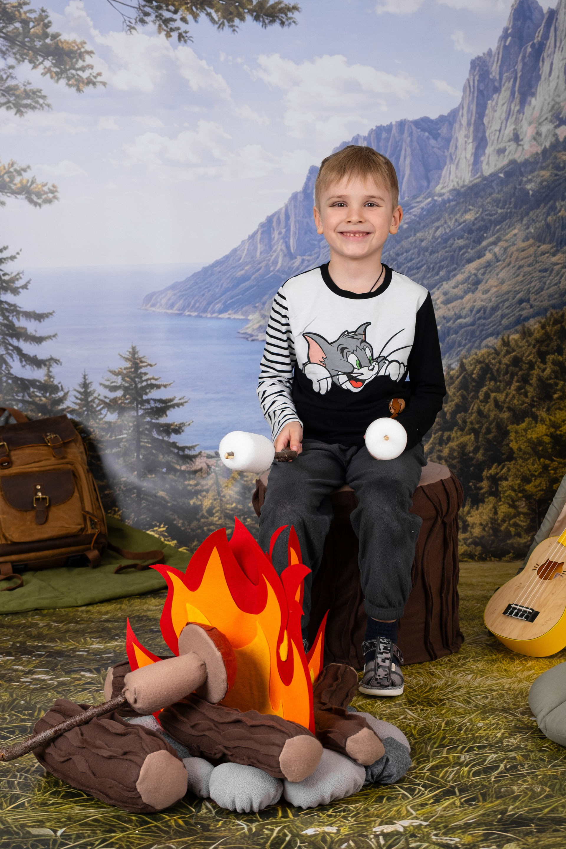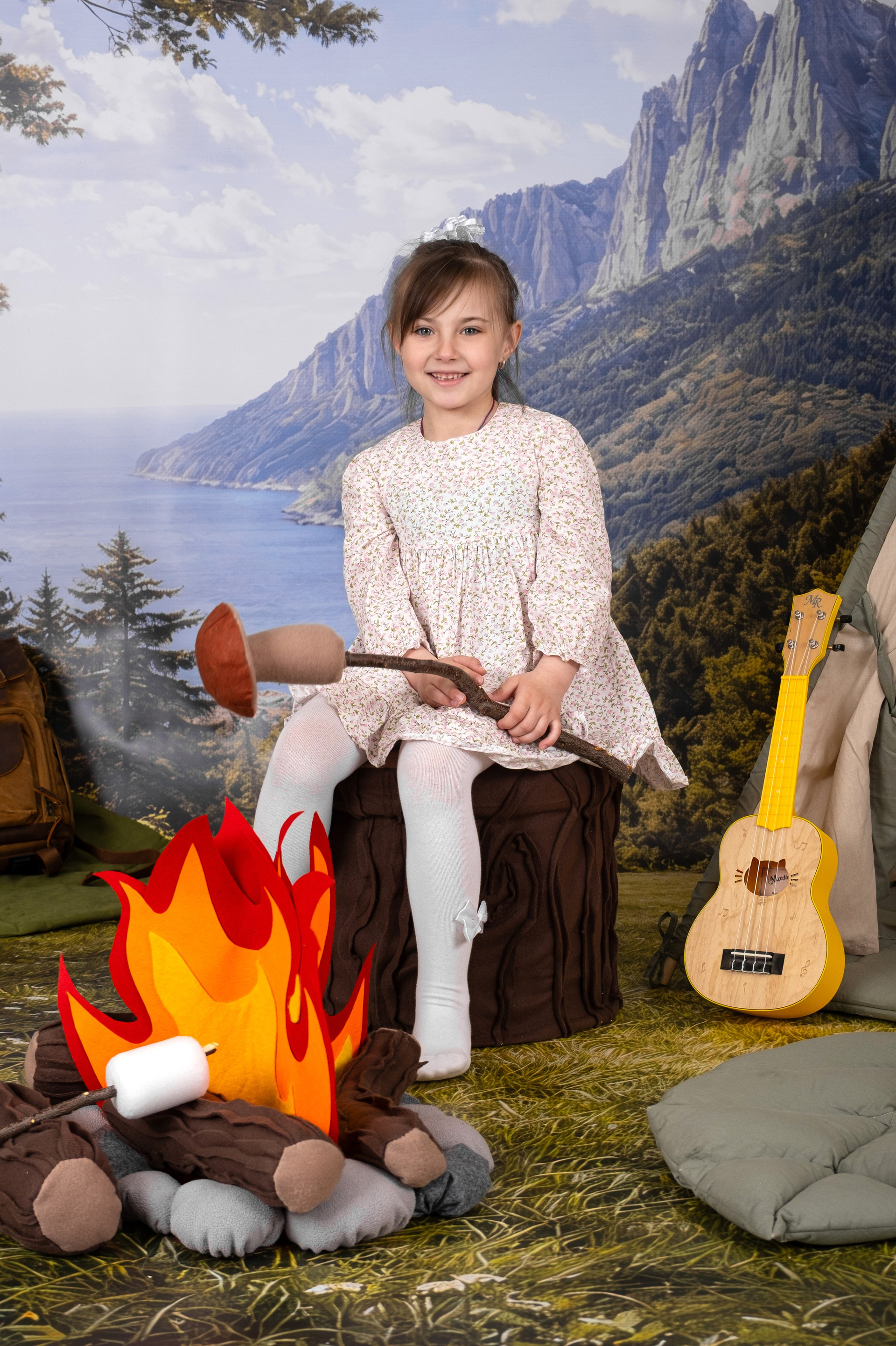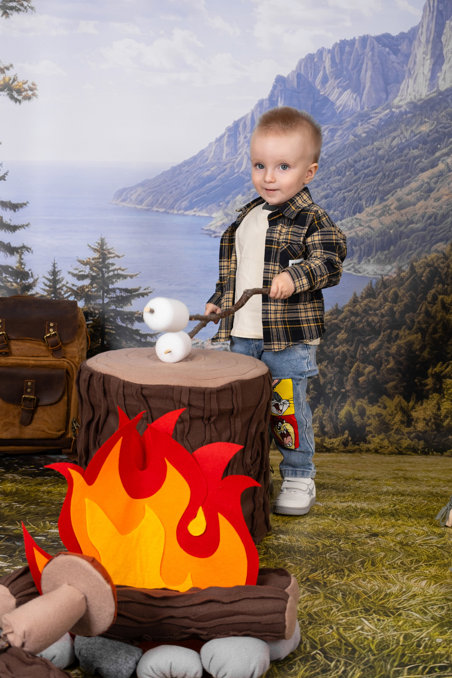 — Яркие декорации: костёр, палатка, рюкзаки, маршмеллоу
